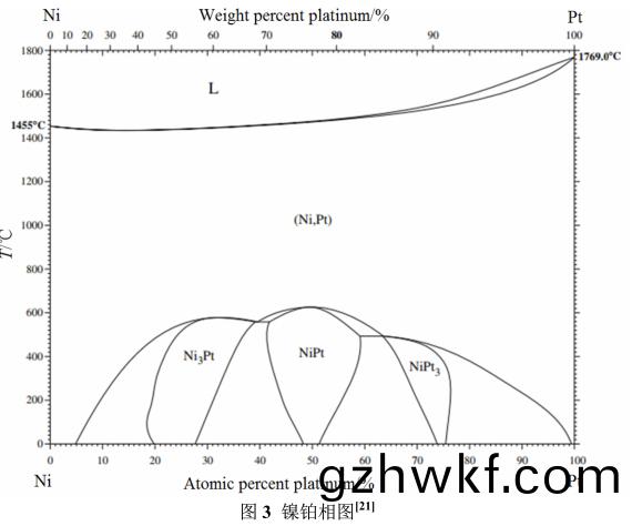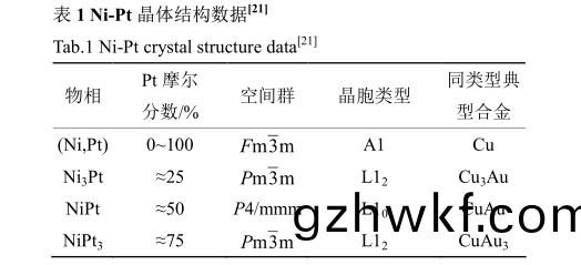 对(dui)镍(nie)铂(bo)合金结(jie)构(gou)与(yu)性(xing)质(zhi)的研(yan)究,是(shi)制备高质量(liang)镍(nie)铂合金(jin)靶(ba)材的(de)基础(chu)。镍(nie)和铂(bo)能(neng)以任何混合(he)比(bi)例(li)形成(cheng)稳定的面心(xin)立方(fang)结(jie)构(gou)固溶(rong)体,而(er)且在相(xiang)应(ying)成(cheng)分(fen)、温度(du)范围(wei)内(nei)存在(zai)类似(shi)于Cu-Au体(ti)系(xi)相似的(de)有(you)序(xu)无序(xu)转(zhuan)变(bian),Ni-Pt体(ti)系相晶体(ti)结构(gou)数(shu)据(ju)如(ru)表1所示(shi),镍(nie)铂合(he)金相图(tu)如(ru)图(tu)3所示(shi)[21]。