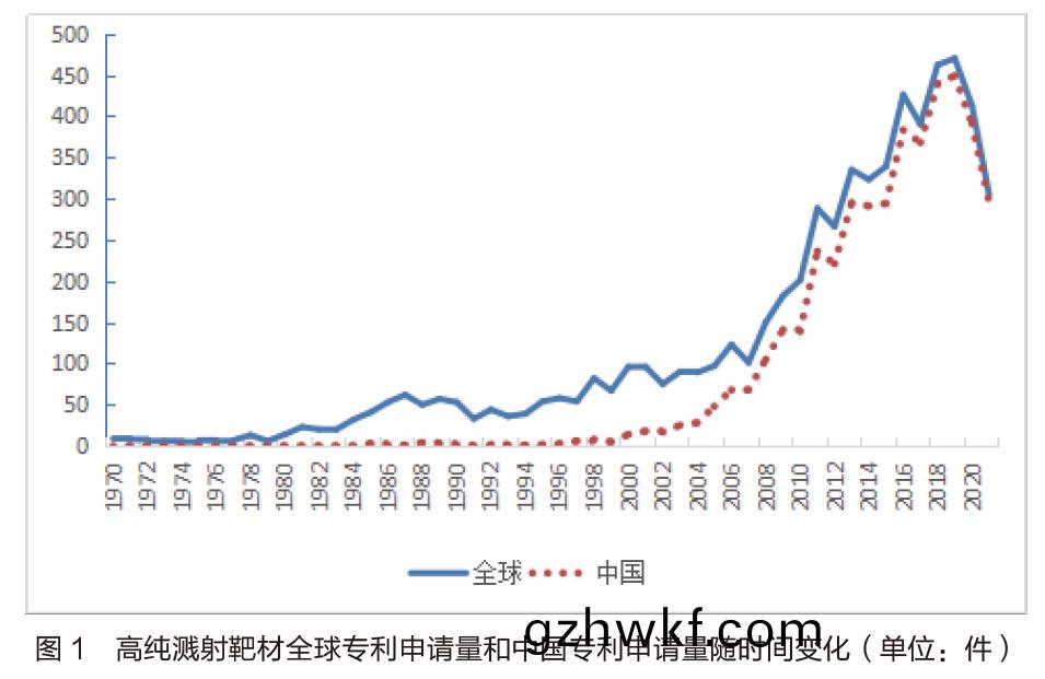 本文主(zhu)要研(yan)究高纯(chun)溅射(she)靶材(cai)全(quan)球(qiu)专(zhuan)利申请状(zhuang)况及(ji)其技术进展,数据(ju)检(jian)索选(xuan)用(yong)中(zhong)国(guo)专(zhuan)利(li)文摘数(shu)据库(ku)(CNABS)和(he)德(de)温特(te)世界(jie)专利索(suo)引数据库(ku)(DWPI)。通(tong)过关(guan)键字(zi)和(he)分类(lei)号在数据(ju)库中检(jian)索获(huo)得初步结果,通过(guo)浏览配(pei)合分(fen)类号(hao)去除明显噪声。数(shu)据检索(suo)截(jie)止(zhi)时(shi)间(jian)为2021 年12 月(yue)31 日(ri)。
