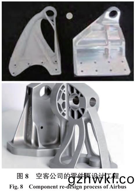通用(yong)电气公司专注(zhu)于(yu)增(zeng)材(cai)制(zhi)造以(yi)降低其(qi)发动机(ji)制(zhi)造成本(ben),采用SLM技(ji)术(shu)已完成大量(liang)零(ling)部件的批(pi)量(liang)制(zhi)造。图7为航空(kong)发动机(ji)燃油喷嘴(zui),将(jiang)20个零件集成为(wei)1个部(bu)件进行打印(yin),减重25%,已(yi)实(shi)现数(shu)万个部件的批(pi)量制造。此(ci)外(wai),空(kong)客通(tong)过(guo)基于有限元分(fen)析(xi)的结(jie)构(gou)优化(hua)应用(yong)于(yu)现(xian)有(you)零(ling)部件(jian)的再(zai)设计(ji),采(cai)用(yong)SLM技术实现了大幅(fu)减(jian)重,如图8所示。